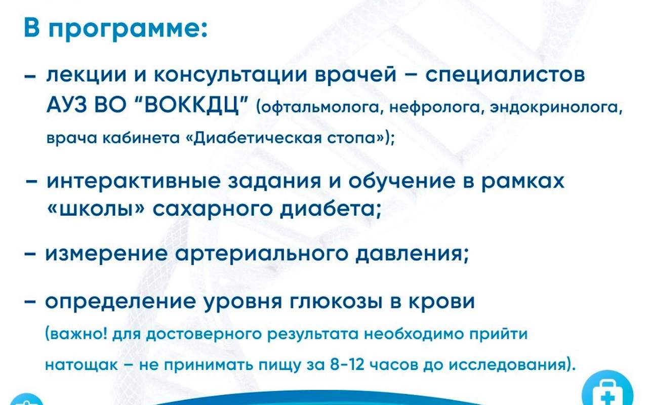 В этот день все желающие смогут посетить лекции и проконсультироваться с врачами АУЗ ВО «ВОККДЦ», бесплатно измерить уровень глюкозы в крови и артериальное давление.