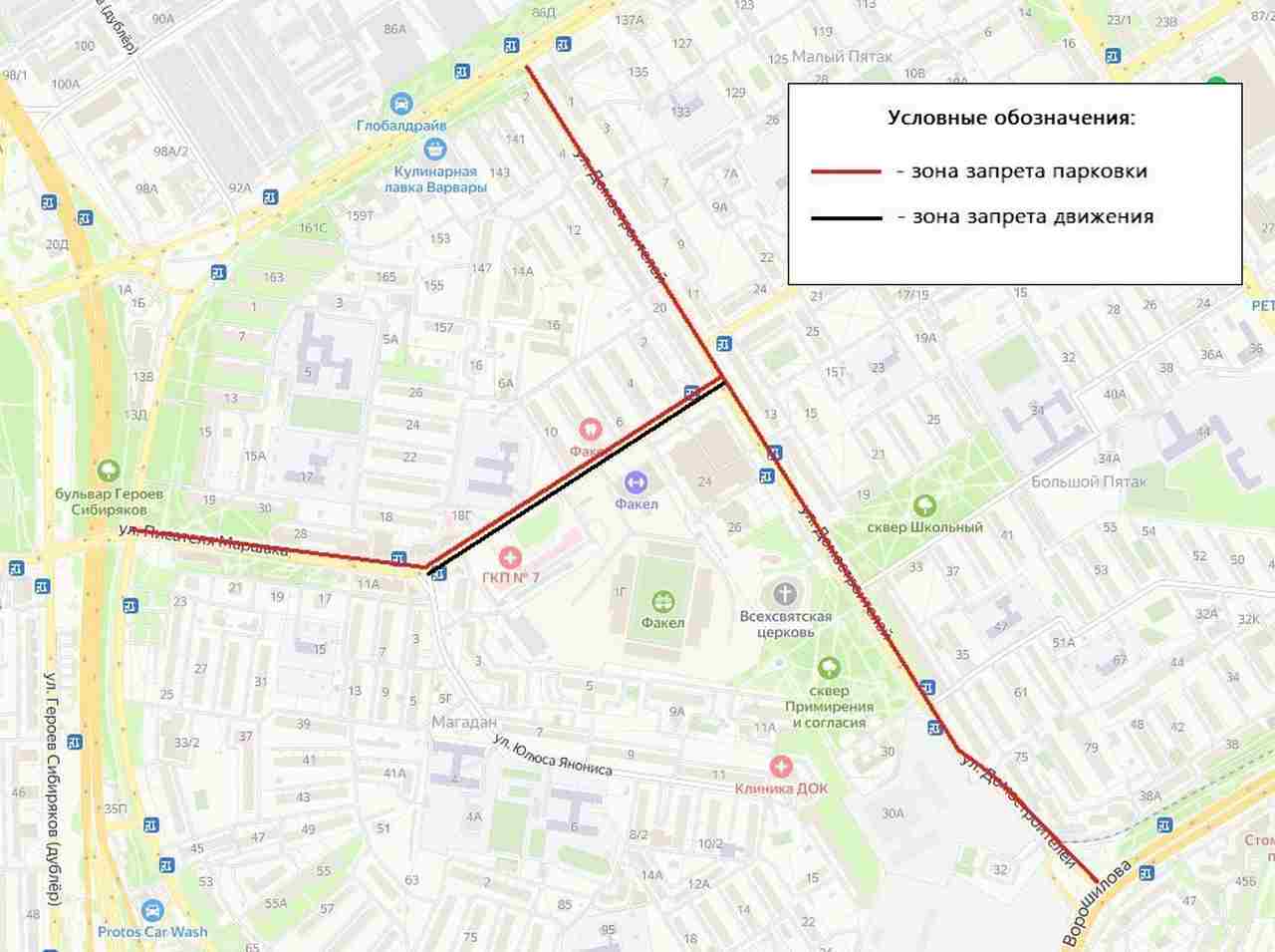 Парковаться и останавливаться нельзя будет уже с 18 часов вечера субботы, 2 августа, и вплоть до полуночи следующего дня — на отрезке улицы Домостроителей между улицами Ворошилова и Пеше-Стрелецкая, а также на улице Писателя Маршака от Дома строителей до Героев Сибиряков.