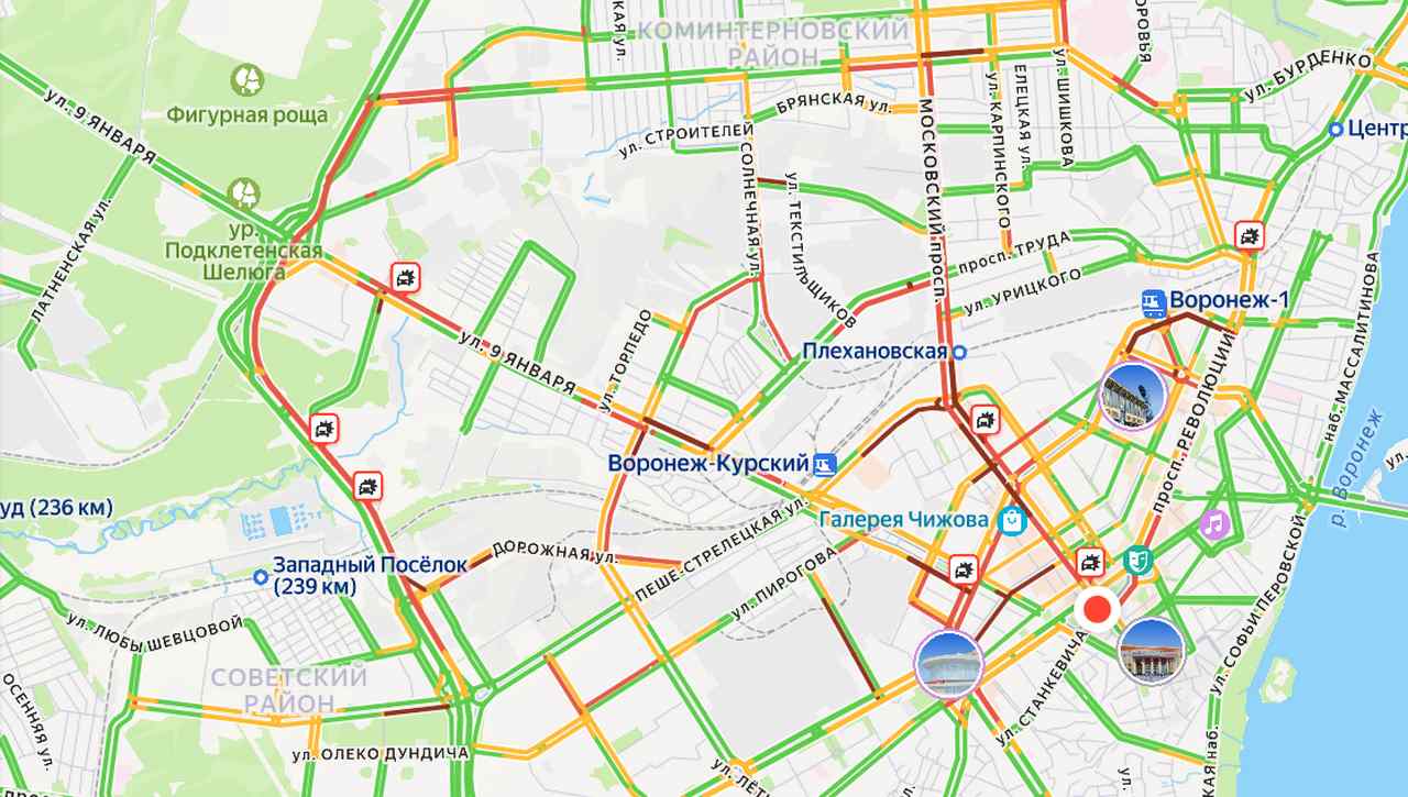 Наиболее тревожная ситуация отмечается в центре города. Сильные автомобильные заторы наблюдаются на Московском проспекте и улицах: Донбасской, Фридриха Энгельса, 9 Января, Свободы, Бахметьева, Героев Сибиряков, Дорожной, Антонова-Овсеенко и других.