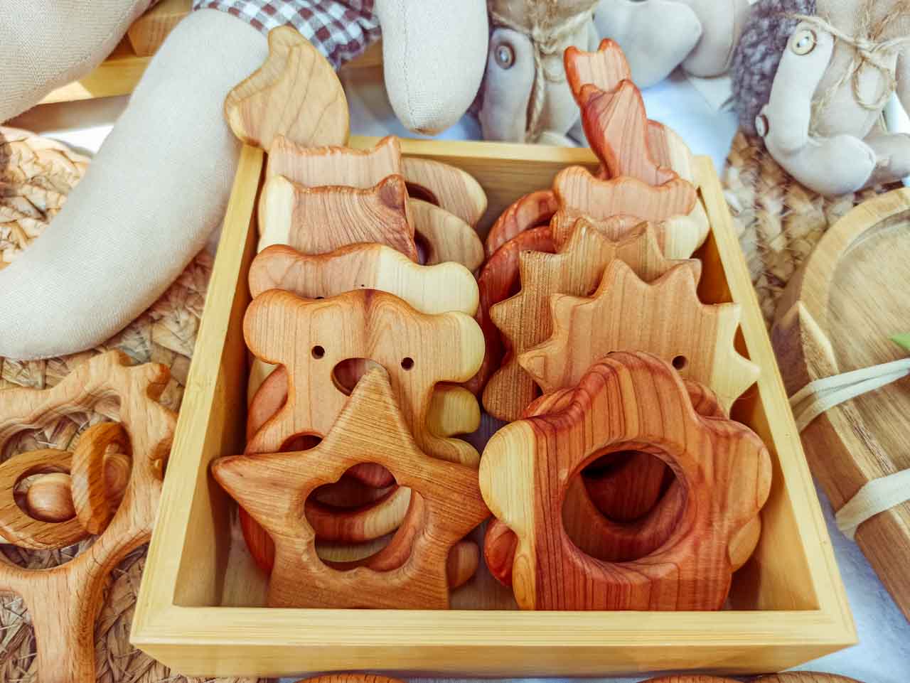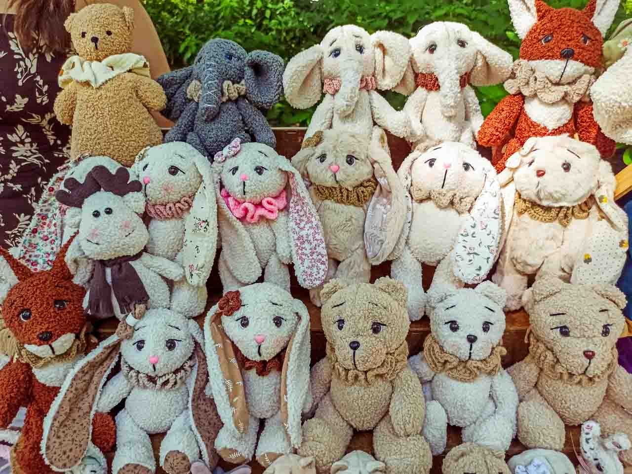 Среди всего разнообразия игрушек выделялись ежики, слоники и зайцы, выполненные из необычного «кучерявого» материала.