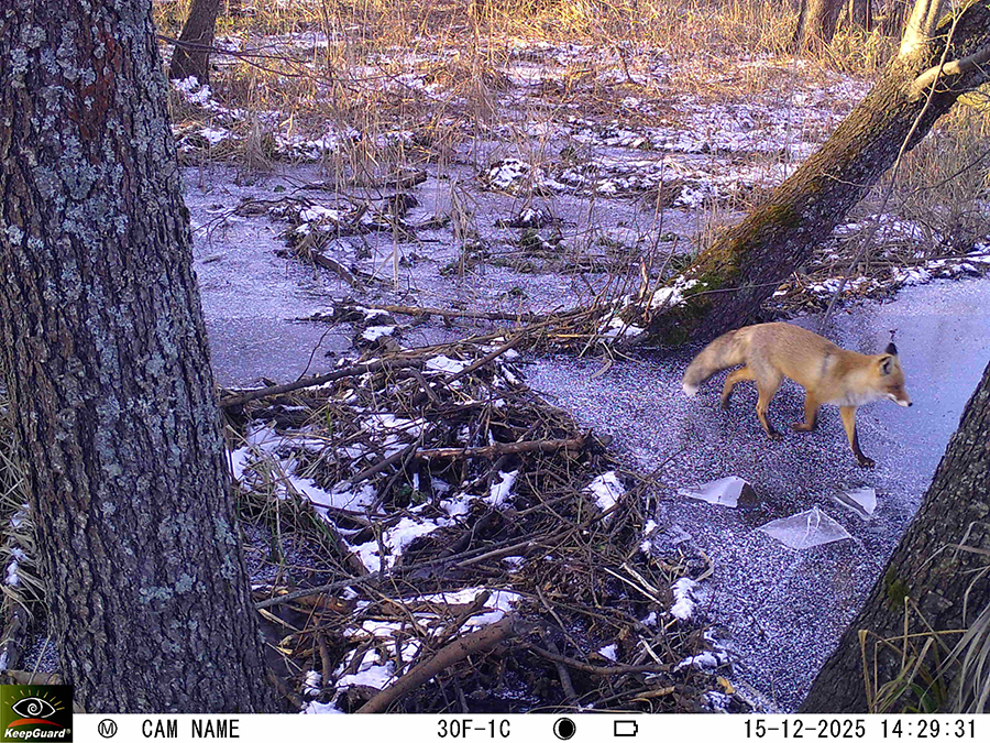 Еще один зверь, которого запечатлела фотоловушка, – лиса. Рыжая хищница оставила метку рядом с просекой и наведалась к бобровой плотине.