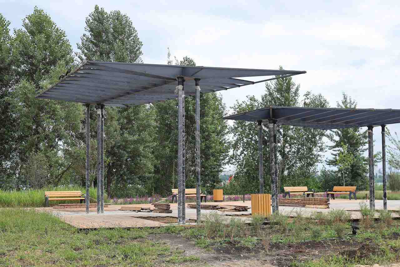 Тем временем на II очереди набережной продолжают появляться новые элементы благоустройства. Подрядная организация начала, например, устанавливать солнцезащитные навесы. Уже смонтировали две такие конструкции. Осталось их надёжно закрепить и обшить композитом. В планах установка ещё четырёх навесов – сваи для них подготовили. Параллельно с этим продолжаются пусконаладочные работы системы автоматического полива озеленённых пространств.