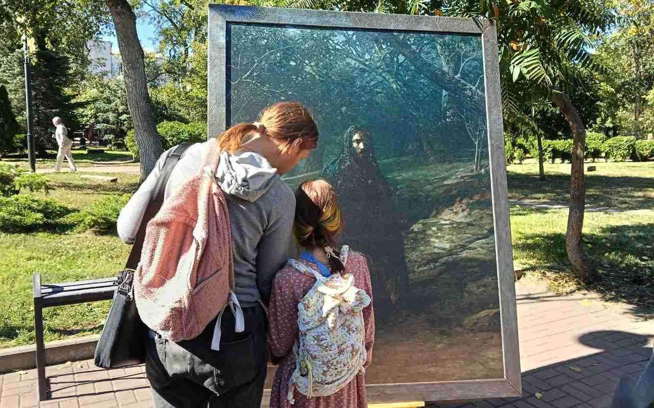 – Эта выставка – классная история. Когда смотришь на картину, кажется, что Христос смотрит на нас. Копия картины выставлена среди деревьев, и это создает особую атмосферу. Кроме того, мне нравится, что фестиваль проходит на мемориальном кладбище. Мне очень по душе такие места, – поделилась поэт и писатель Мария Соколовская.