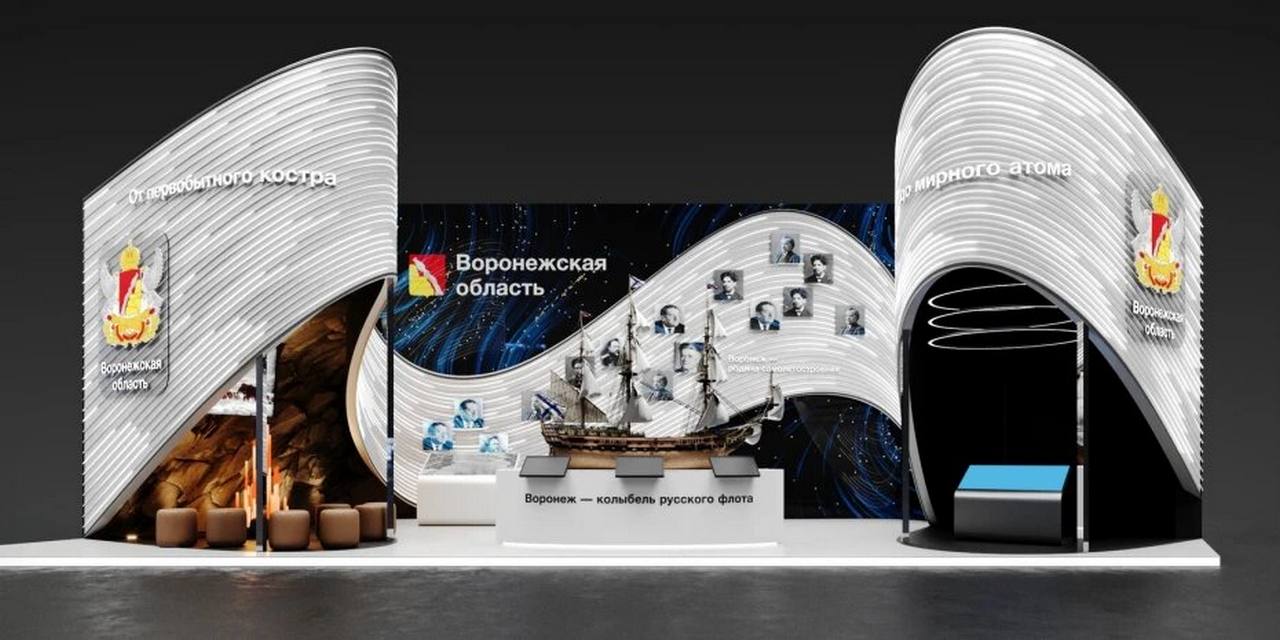 Стенд Воронежской области, названный «От первобытного костра до мирного атома», представит собой временную ленту, отражающую развитие региона от древности до современности. Ключевым элементом станет мультимедийная «река», символизирующая реки Воронеж и Дон, на верфях которых по приказу Петра I в период с 1696 по 1711 год были построены первые 200 судов для российского военно-морского флота.
