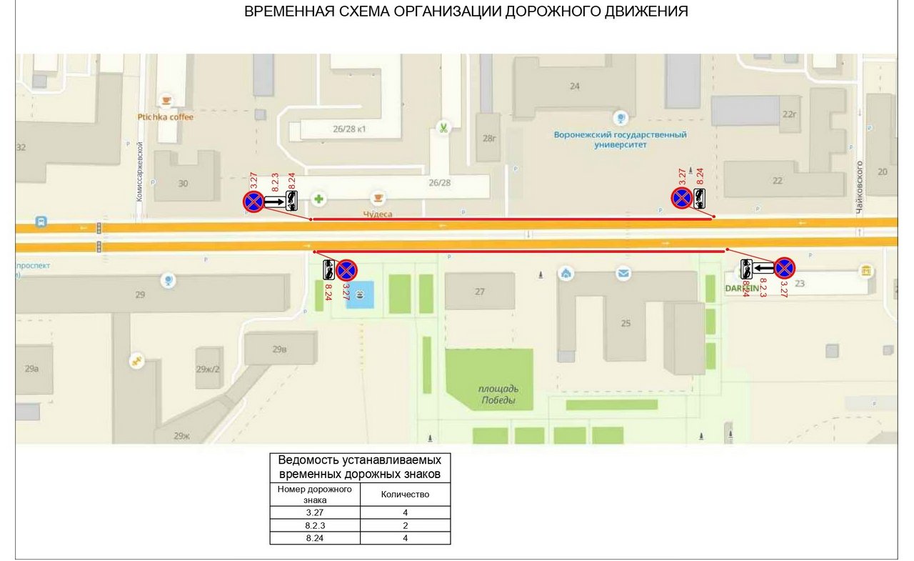 Как рассказали в управлении дорожного хозяйства Воронежа, запретят парковку и остановку на проспекте Революции – от дома №29 до дома №23 по нечётной стороне и от дома №22 до дома №30 по чётной.