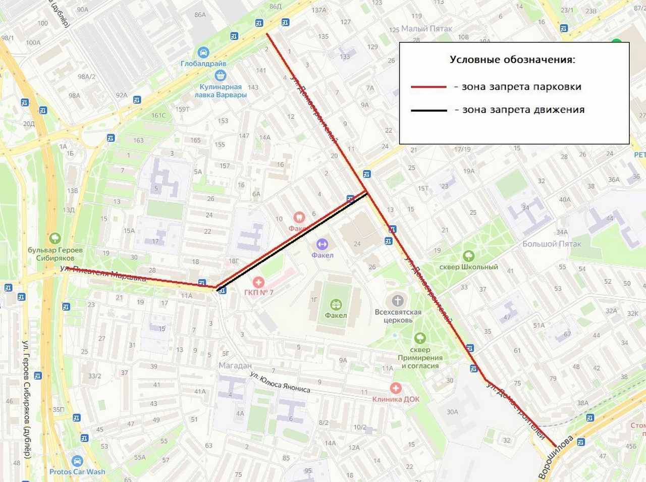 - с 18:00 15 октября до 21:30 16 октября будет запрещена парковка (и остановка) на участках улицы Домостроителей (от улицы Ворошилова до улицы Пеше-Стрелецкой) и Писателя Маршака (от улицы Домостроителей до улицы Героев Сибиряков);