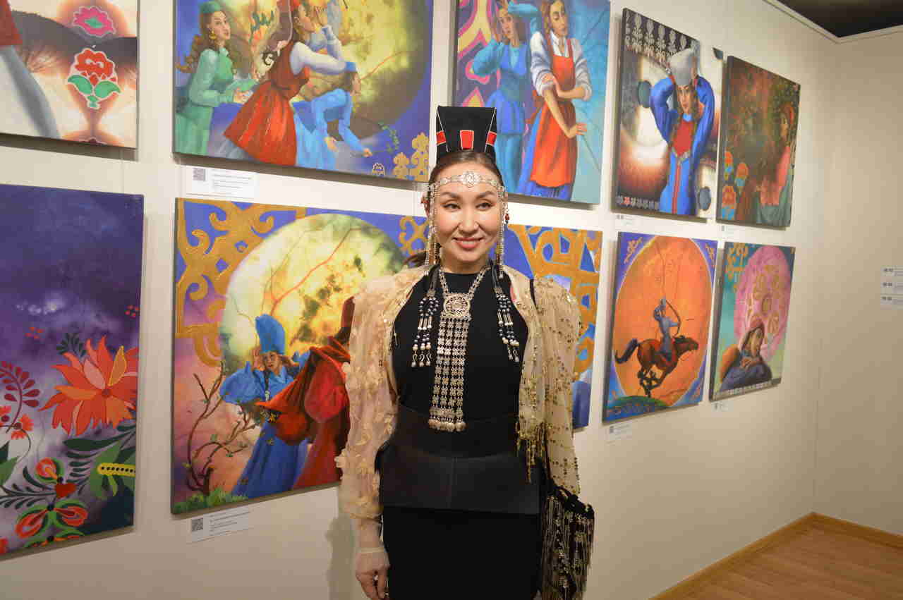 На открытии выставки она предстала перед зрителями в якутском национальном образе, продуманном до мелочей. Например, наряд Миры включал нагрудное женское украшение, которое в классическом варианте весит 7 кг. На голове художницы была якутская бастына, все узоры в которой имеют сакральное значение.