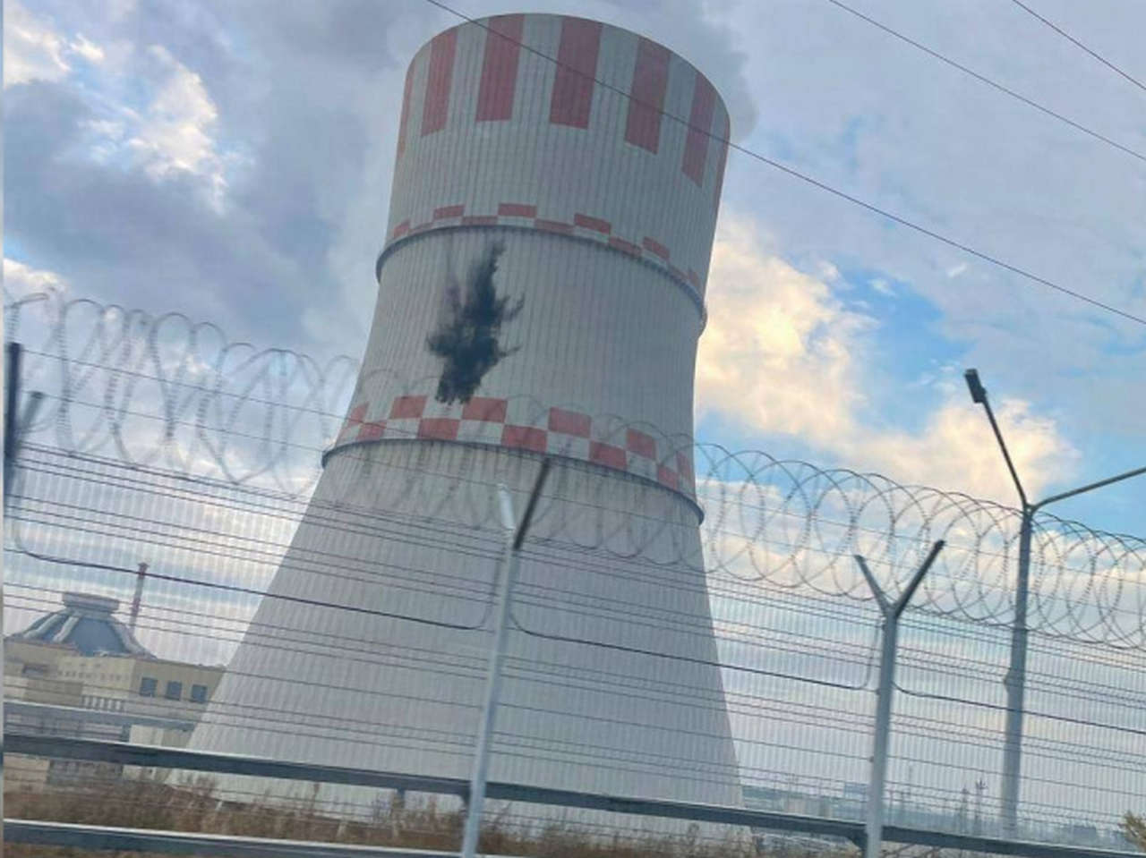 На градирне, сооружении, предназначенном для охлаждения значительных объёмов воды и запечатлённом на фото, виден тёмный след от взрыва беспилотника.