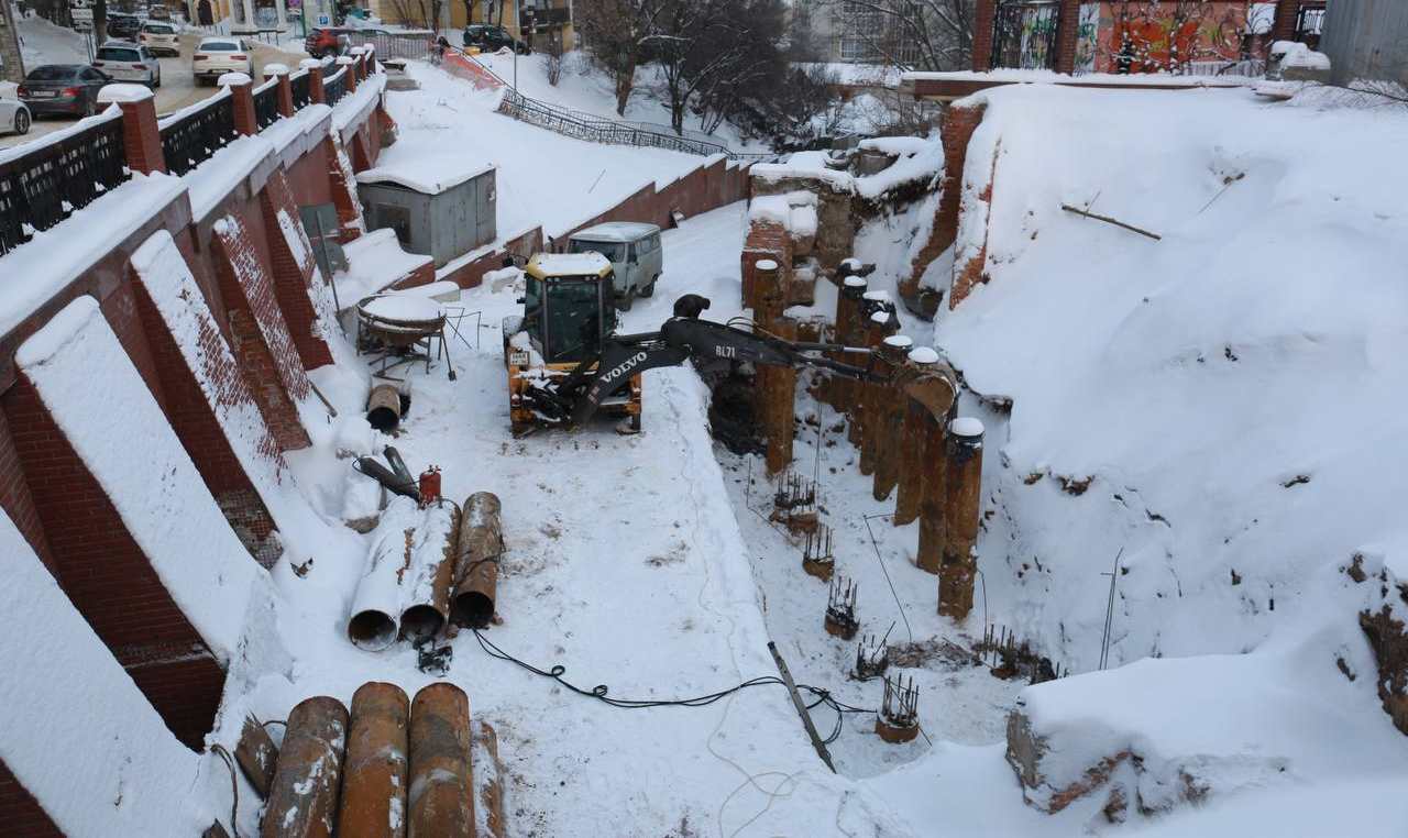 В рамках муниципального контракта между управой Центрального района и подрядной организацией рабочие уже демонтировали временное подпорное сооружение, очистили территорию, вынесли разбивочные оси и забетонировали 22 сваи.