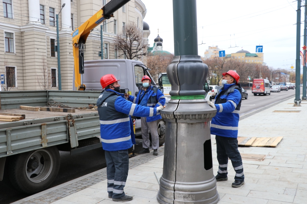 На проспекте Революции начали монтировать декоративные чугунные элементы опор освещения. Нижняя часть обнарядки опоры и два переходника – декоративных элемента, оформляющие стыки труб, полностью повторяют исторический вид. К концу года будет установлено 30 декоративных комплектов, остальные появятся после того, как будет полностью уложено плиточное покрытие.