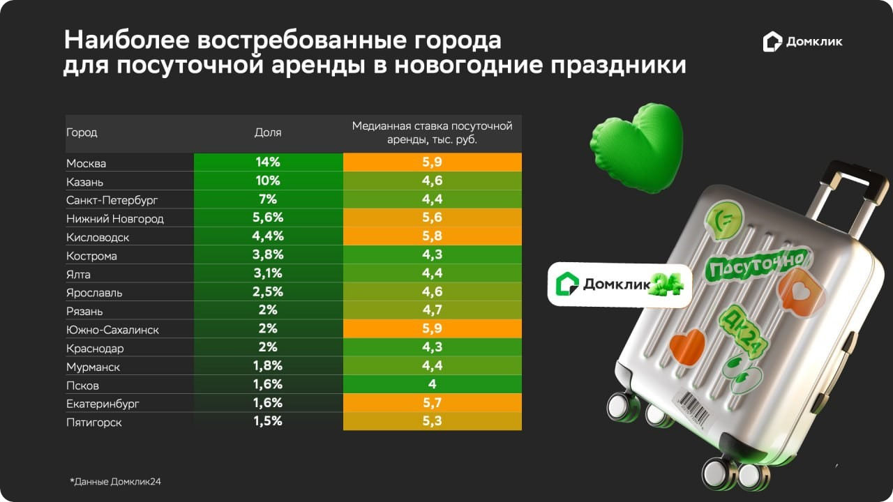 Как и в прошлом году, самыми популярными городами для посуточной аренды в новогодний период стали Москва (14% от общего количества бронирований), Казань (10%) и Санкт-Петербург (7%). Также среди городов-миллионников в топ-15 вошли Нижний Новгород (5,6%), Краснодар (2%) и Екатеринбург (1,6%).