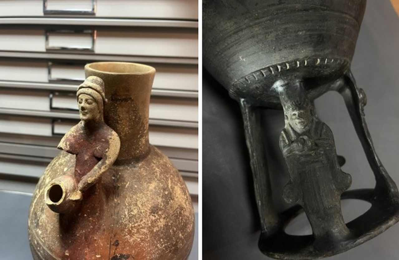 На родину прибыли следующие предметы: вазон родом с Кипра (VI век до н. э.), чашка-резервуар греческого происхождения (VIII век до н. э.) и этрусская миска с изображением кариатид (VII век до н. э.).