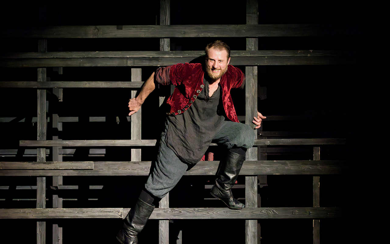 В нашей культурной памяти образ Пугачева неразрывно связан с историей Петруши Гринева и капитанской дочки Маши Мироновой. И зачином спектакля послужит сказ об Орле и Вороне из упомянутой пушкинской повести в изложении Калики (Владимир Топцов), который на протяжении спектакля с древним, возможно, аутентичным музыкальным инструментом в руках будет комментировать происходящее, как бы заглядывая в будущее, зная начало и конец этой истории. А Скоморох (Владислав Ташбулатов), напротив, будет мгновенно реагировать на происходящее здесь и сейчас – то вдруг вскрикнет птицей, и этот пронзительный горловой звук накалит, сгустит атмосферу сцены, то выдаст «небылицы в лицах, небывальщины», как в шутливо-сказочной форме скоморохи изображали «жизнь навыворот». В постановке используется стилизация, сочиненная Высоцким для спектакля Любимова. И эта своего рода цитата прямо указывает на связь двух постановок.