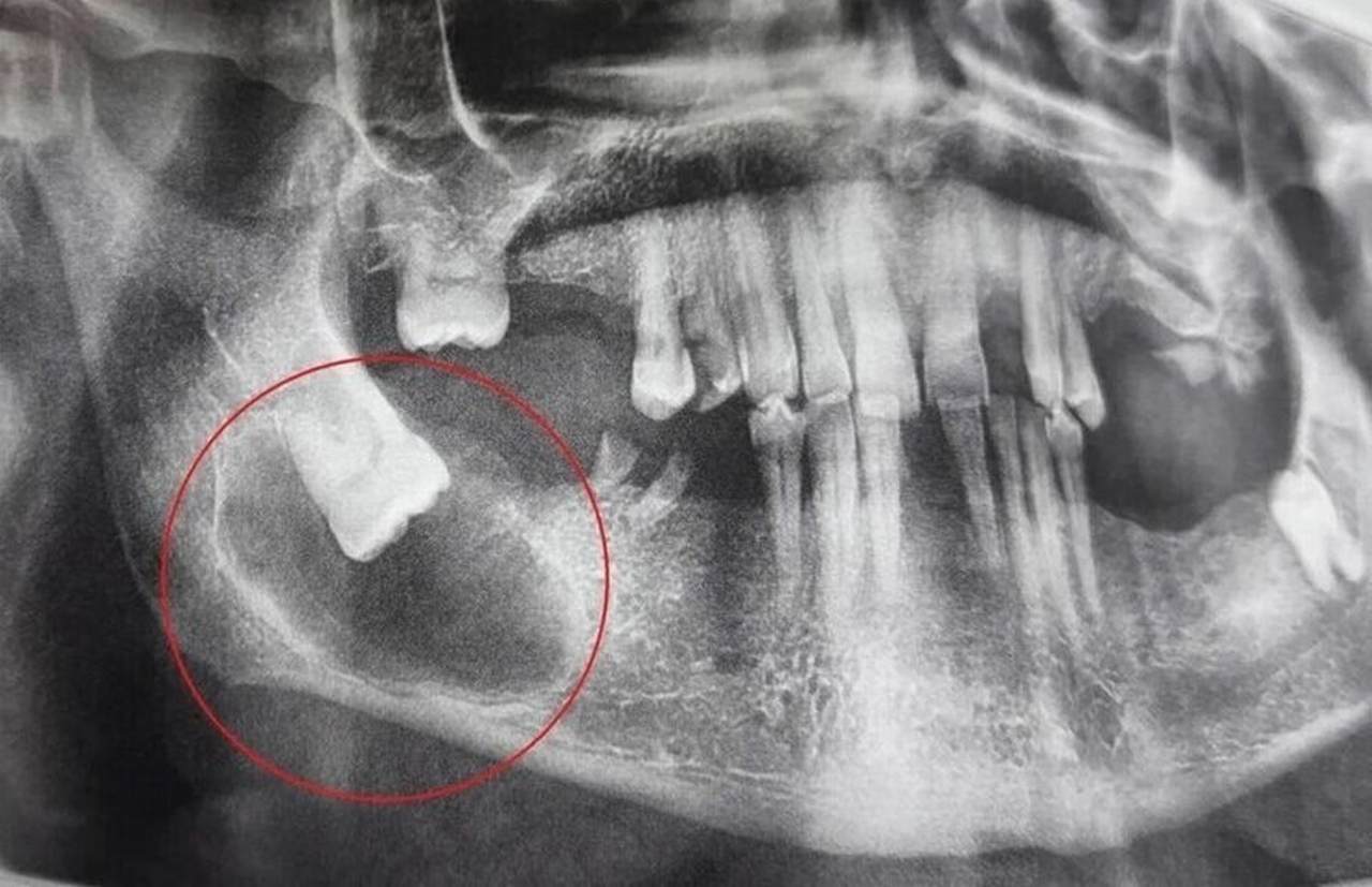 Детальная диагностика подтвердила, что зуб мудрости остался в кости, заняв горизонтальное положение. Вокруг его коронки и части корня сформировалась фолликулярная киста, которая постепенно разрушала костную ткань челюсти.