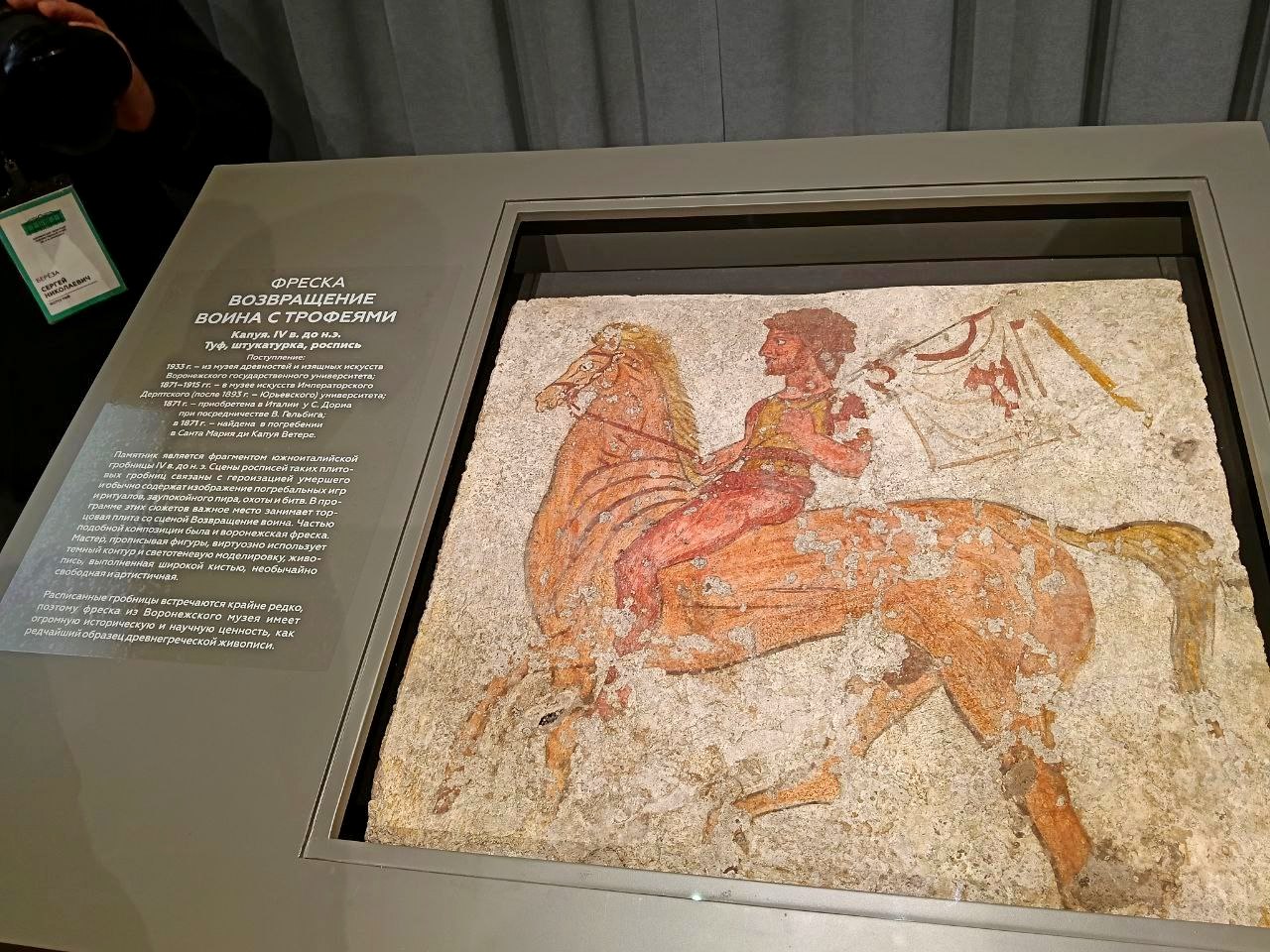 Фреска IV века до н.э., изображающая воина-всадника, возвращающегося домой с трофеями, ранее в музее Крамского не выставлялась. Она хранилась в запасниках и была в плачевном состоянии.