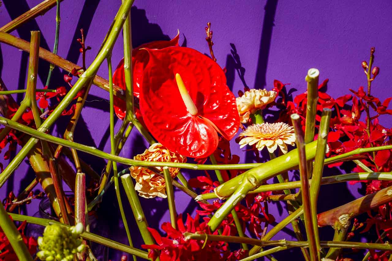 Для создания инсталляции Евгения выбрала изысканные антуриумы и орхидеи, а также простые цветы, растущие на дачах, – книфофии и герберы.