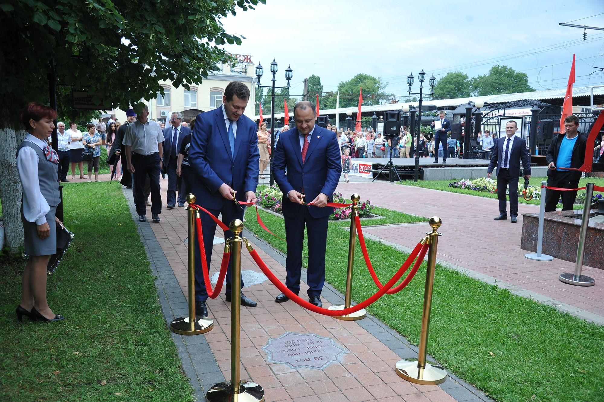 Затем Виталий Шабалатов и Сергей Задорин перерезали символическую ленту в честь открытия памятного знака, посвященного прибытию первого пассажирского поезда в Воронеж.