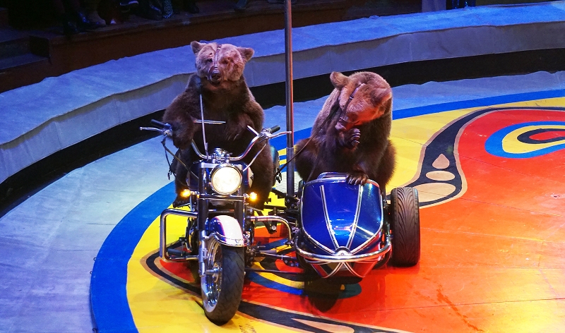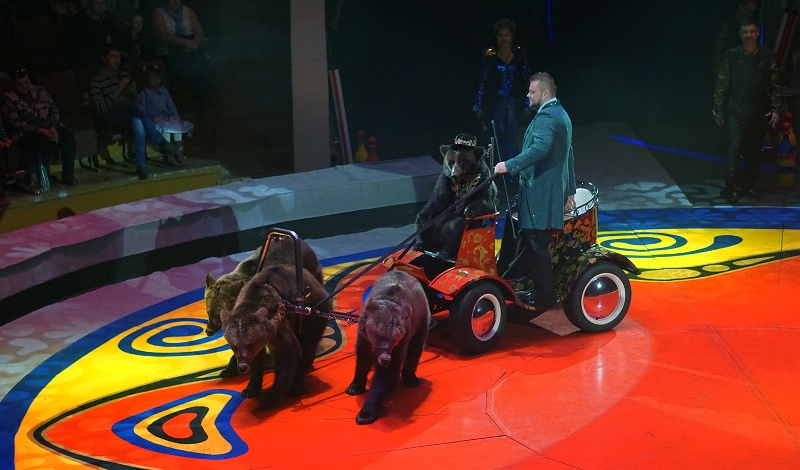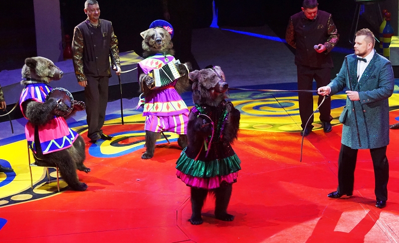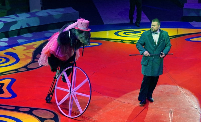 Александр Филатов деда живым не застал, но все его заветы знает наизусть. Он знает, с какой стороны лучше подойти к медведю, чтобы тот не кинулся, и как найти с хищником общий язык. "Медвежий цирк" занимает почти все второе отделение программы. И это самое настоящее медвежье царство. 15 косолапых воспитанников Александра Филатова выступают в качестве акробатов, жонглеров, эквилибристов, роликобежцев, велосипедистов и даже мотоциклистов! Уникальной является групповая езда медведей на велосипедах, причем три медведя едут против часовой стрелки, а центральный медведь – по часовой. Именно он – настоящая звезда! – единственный в мире медведь, который выполняет трюк такой сложности. Этот 21-летний артист выходит на манеж, самостоятельно подходит к лежащему на нем велосипеду, поднимает его, садится и едет! Три года потребовалось, чтобы научить медведя кататься на велосипеде, и еще дополнительно два – чтобы научить его самостоятельно поднимать "железного коня" и садиться на него. Не менее удивляет и езда очаровательной медведицы в розовом платье на большом велосипеде "Паук", у которого переднее колесо огромное, а заднее – малюсенькое.