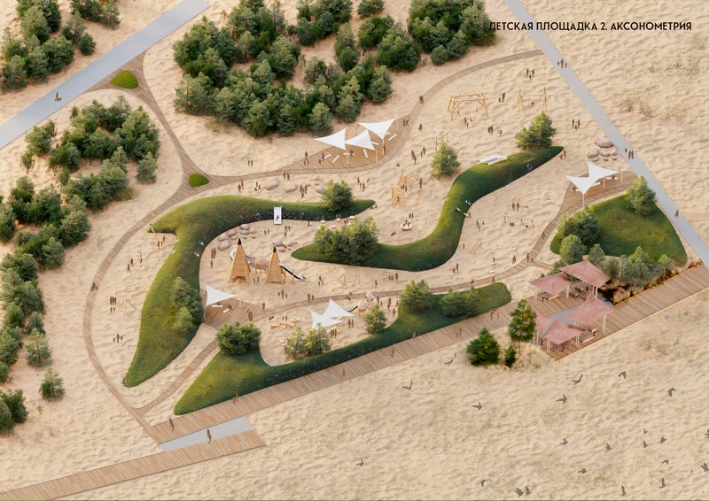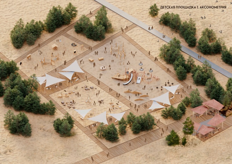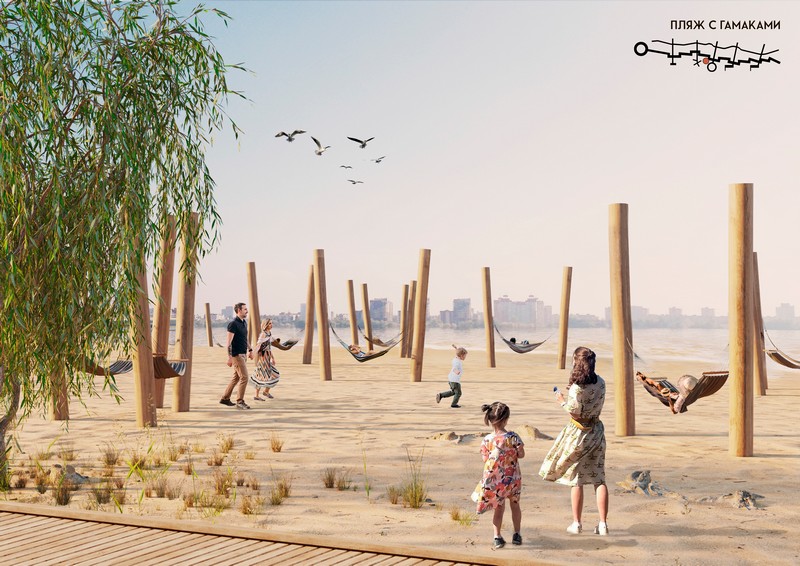 Поэтому проектировщики предусмотрели усиление природной составляющей песчаного пляжа, воды и существующей растительности. Также за счёт навесов и деревьев на набережной будет много тени, а по песку можно будет прогуливаться босиком.