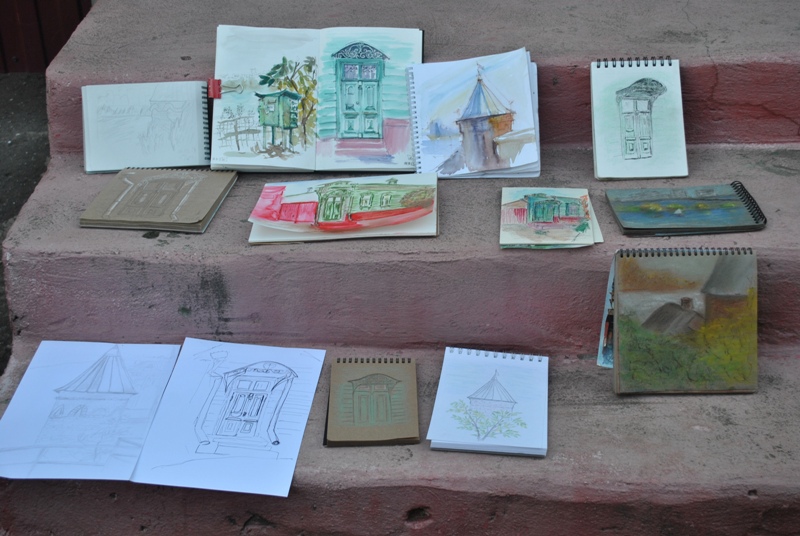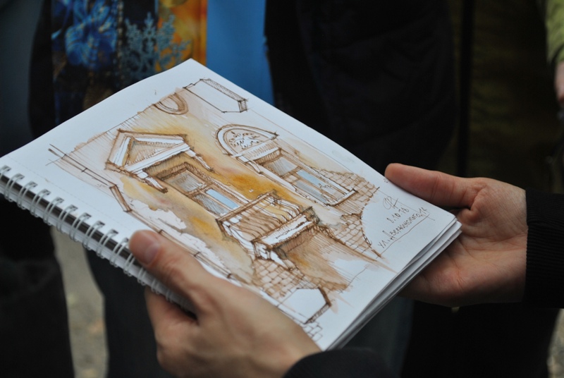 Постоянные участники «Архитектурных прогулок» носят с собой целый художественный арсенал, новички же берут только тетрадку или школьный альбом для рисования, гелевую ручку и простой карандаш. Этого достаточно, чтобы изобразить в своем блокноте небольшую историю.