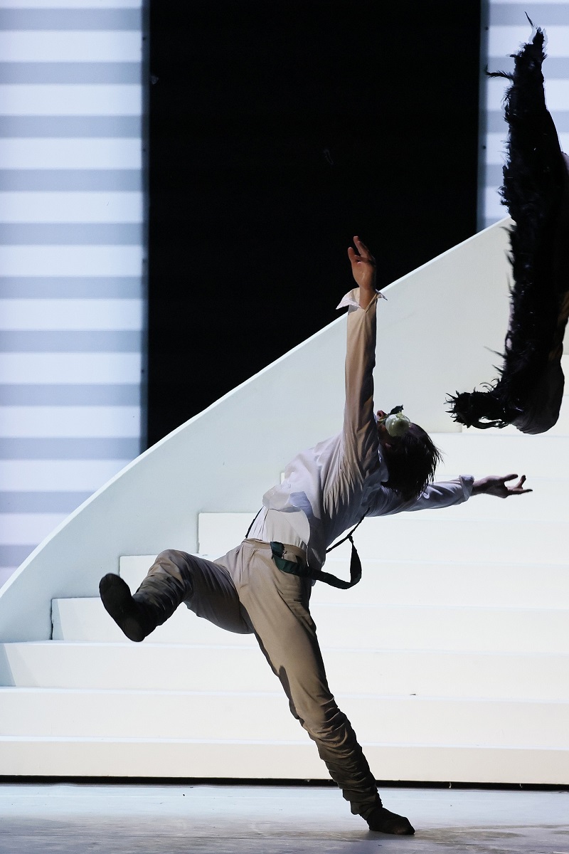 Драматургия в балете, безусловно, присутствует, но какие-то связующие нити, словно специально, выброшены хореографом из контекста повествования. К примеру, Катарина влюбляется в Петруччо очень быстро, и тут же возникает вопрос – почему Жан-Кристоф Майо предоставляет это зрительскому воображению, сам не предлагает никаких разумных версий. Кто кого укрощает – тоже показано в некотором балансе соперничества; но Катарину, поставившую Петруччо на колени перед женой, однозначно трудно представить в оригинальном тексте.