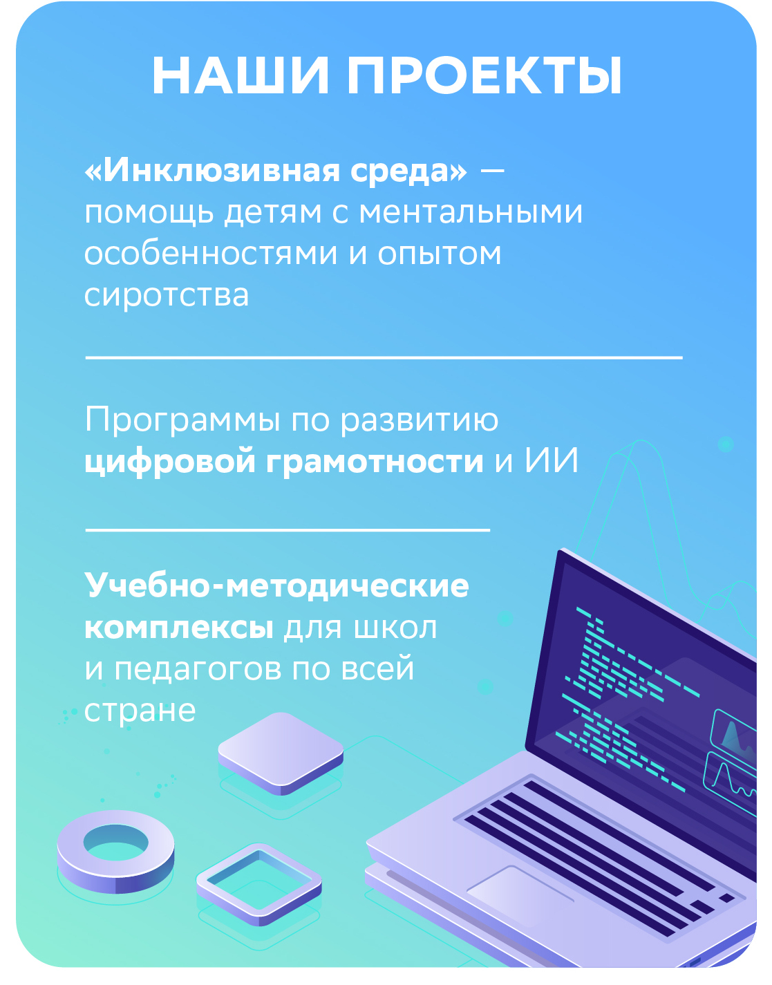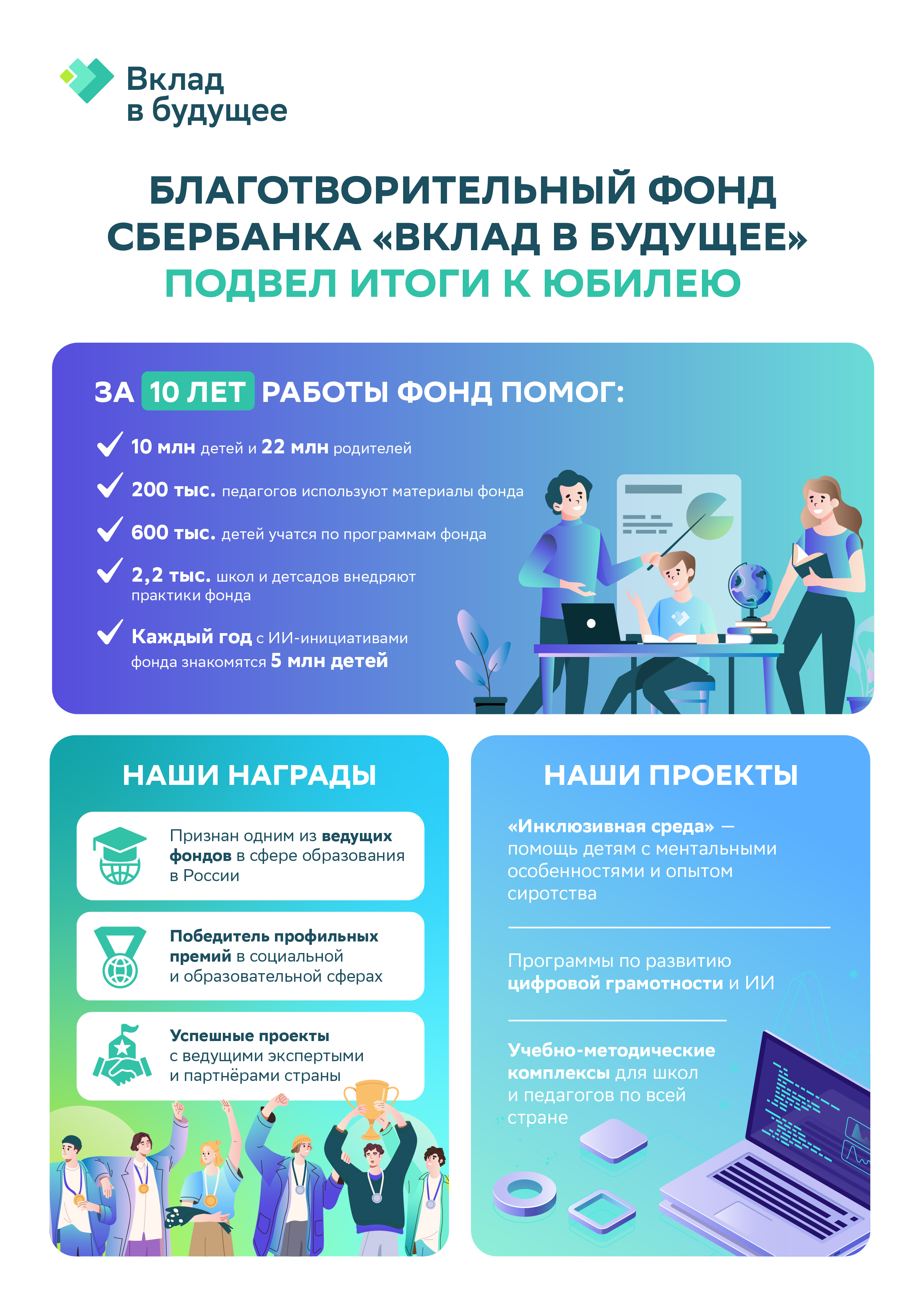 «В этом году — особая дата: Благотворительному фонду "Вклад в будущее" исполняется 10 лет. Десять лет надежд, свершений, тёплых рук, открытых сердец и настоящих перемен. Когда в 2015 году мы создавали фонд, перед нами стояла амбициозная задача: не просто помогать, а менять реальность — строить социальную среду, где каждый ребёнок, независимо от обстоятельств, получит шанс раскрыть свой потенциал. Где инклюзивная среда станет нормой, а цифровые и финансовые навыки — доступной базой для будущего. Мы не учим детей за них — мы создаем условия, в которых они могут учиться сами, пробовать, ошибаться, находить свой путь. Сегодняшние результаты — это не просто цифры, а следствие долгой работы с педагогами, НКО, регионами. Главное, что удалось — не просто запустить проекты, а встроить поддержку в повседневную практику школ, семейств, сообществ. Это и есть основа для настоящих, устойчивых изменений».