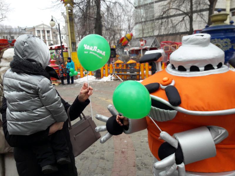 Вот и тем собравшимся на праздничную площадку людям, кто пришли без масок, раздавали их совершенно бесплатно. А затем всем деткам дарили воздушные шары. Всех без разбора также бесплатно угощали горячими блинами со сгущёнкой – очень вкусно! А ещё можно было сфотографироваться в специально оборудованной фотозоне среди красочных самоваров и потанцевать с ростовой куклой – Самсоном Самоваровым.