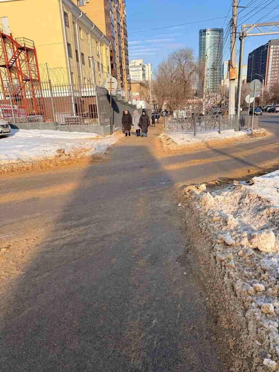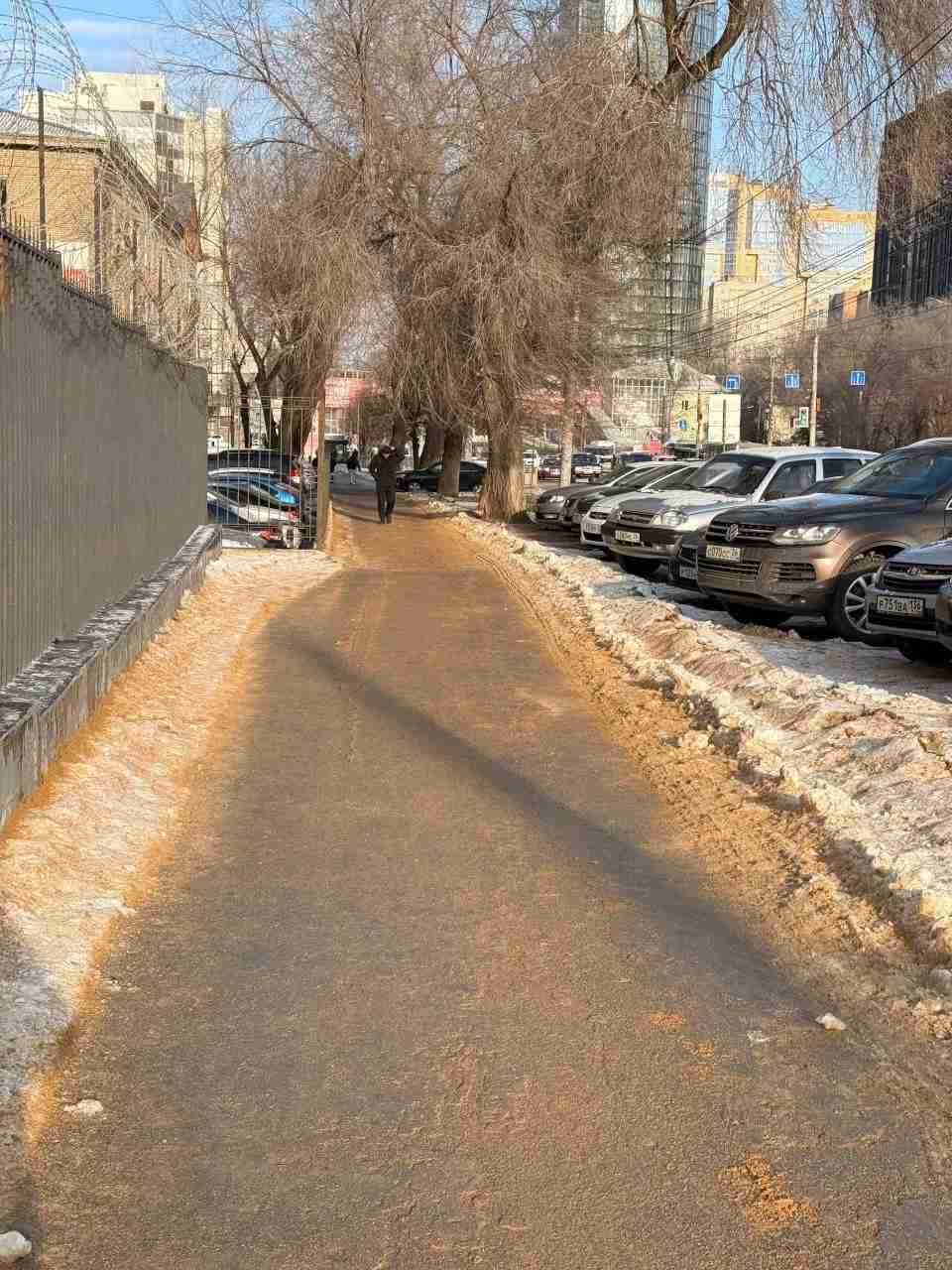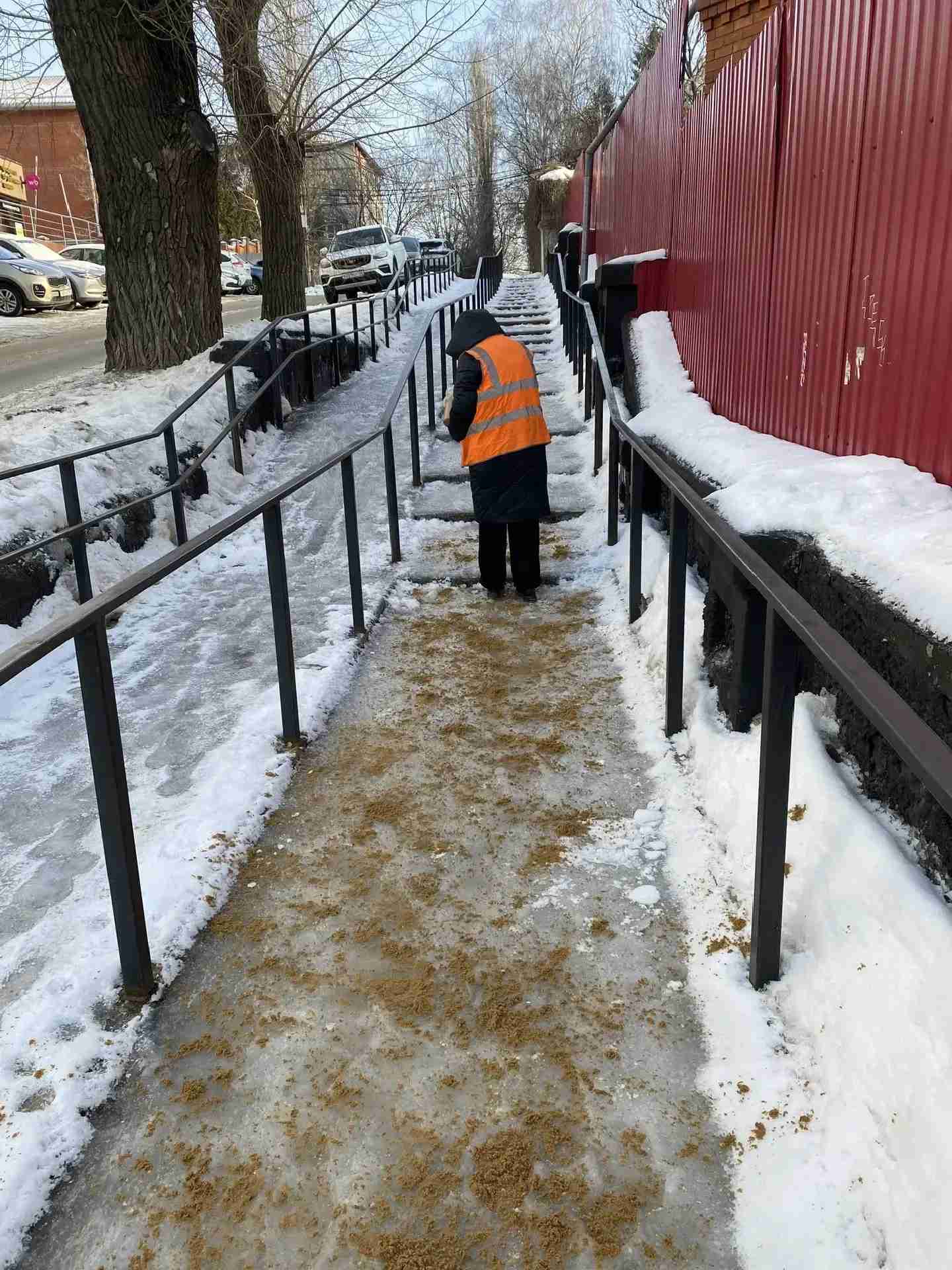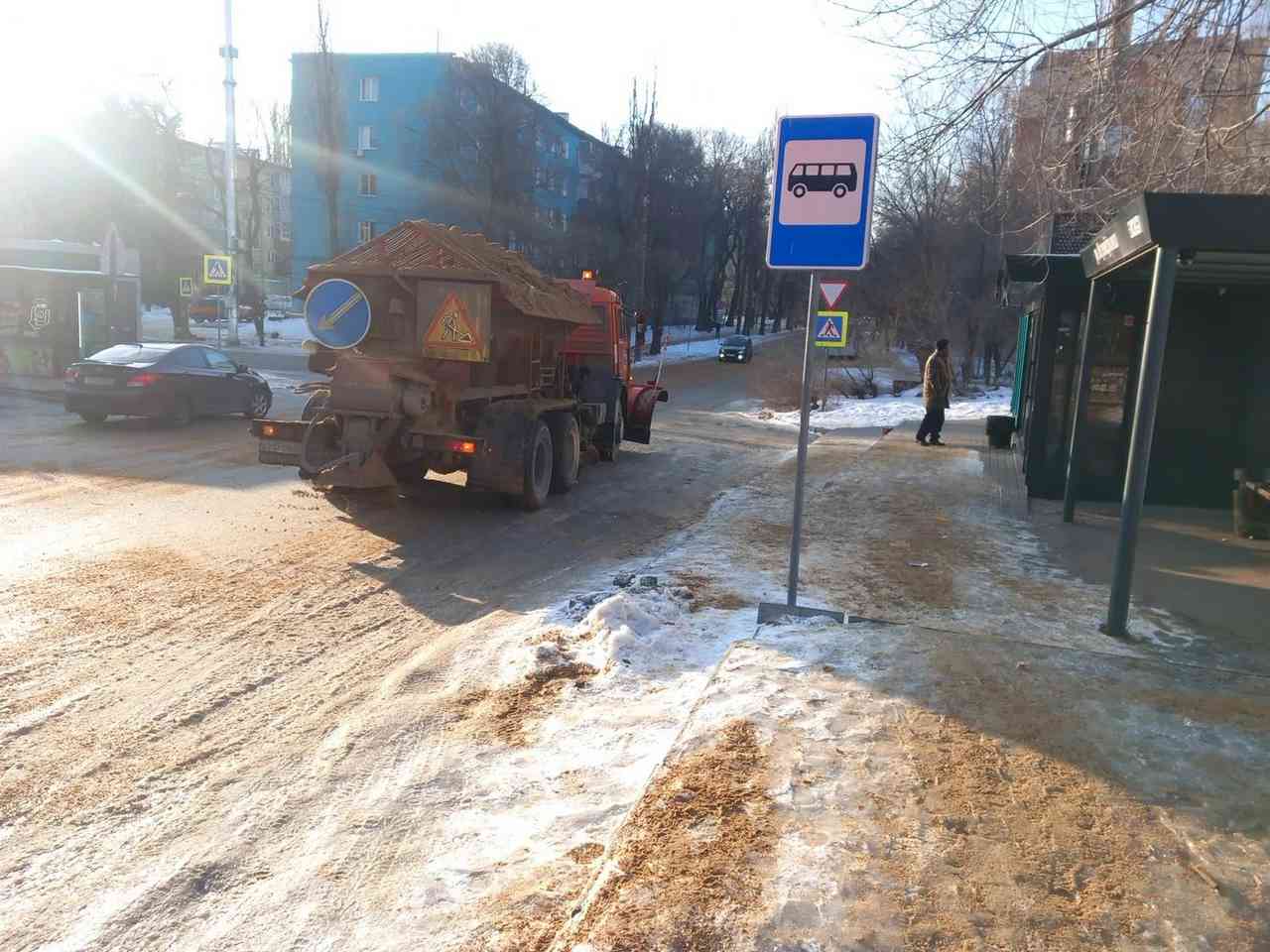 Более 700 тонн пескосмеси ушло днём на посыпку тротуаров, спусков и подъёмов в Воронеже