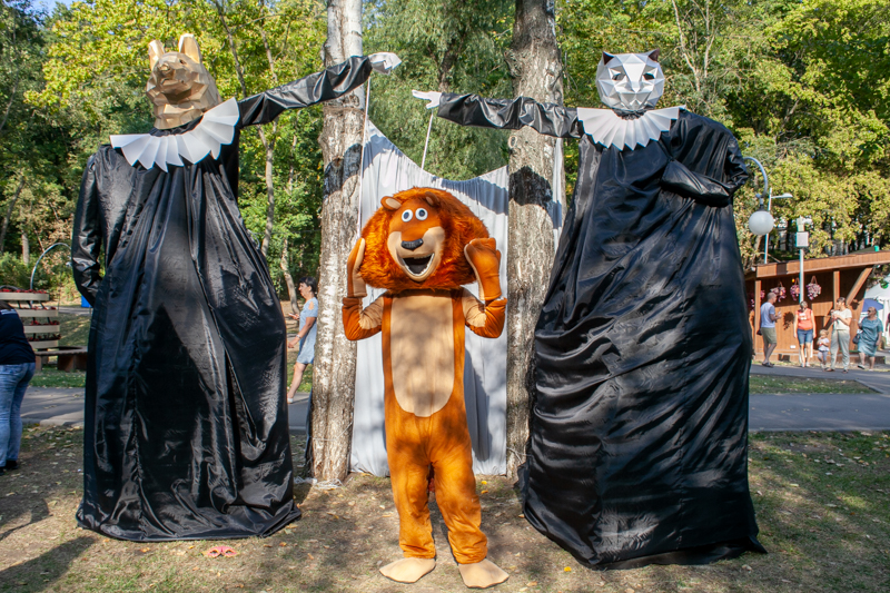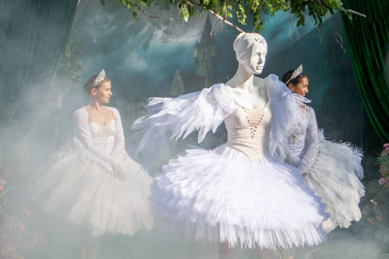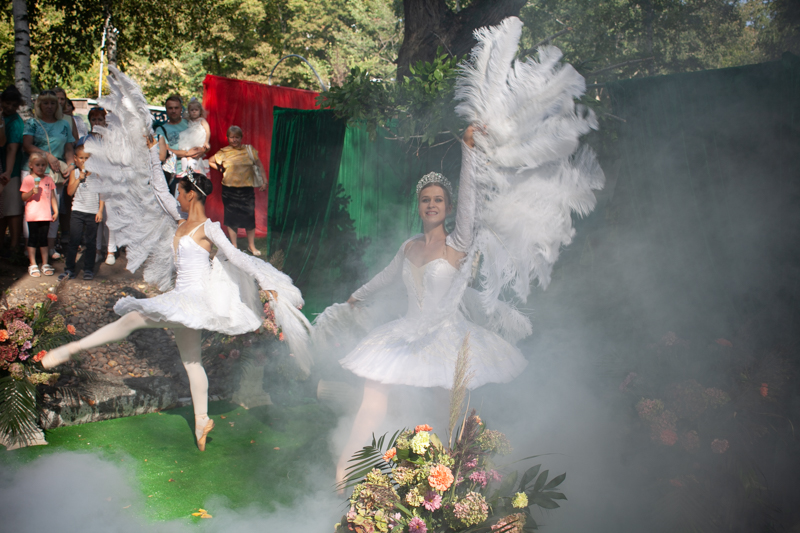Эдита и Роман Серебрянские, которые ежегодно участвуют в фестивале «Город-сад», представляя работы на акватории паркового ручейка, в этот раз воплотили балет «Лебединое озеро». Они создали цветочный сад, состоящий из 1,5 тыс. цветов и смонтировали, можно сказать, полупрофессиональную сцену, где танцуют воспитанницы хореографического училища. Сцена сделана из водонепроницаемой фанеры и закреплена на металлических брусьях – ее устанавливали специалисты-строители, чтобы она была устойчивой и крепкой. Затем сцену декорировали бархатными цветочными кулисами.