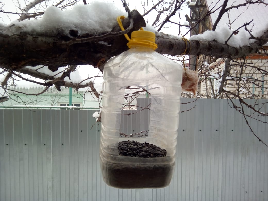 Если на изготовление кормушки нет времени и сил, сделать ее можно из обычных молочных коробок или пятилитровых баклажек. Крупные птички в таких коробках не поместятся, зато синички и воробьи будут благодарны за заботу.