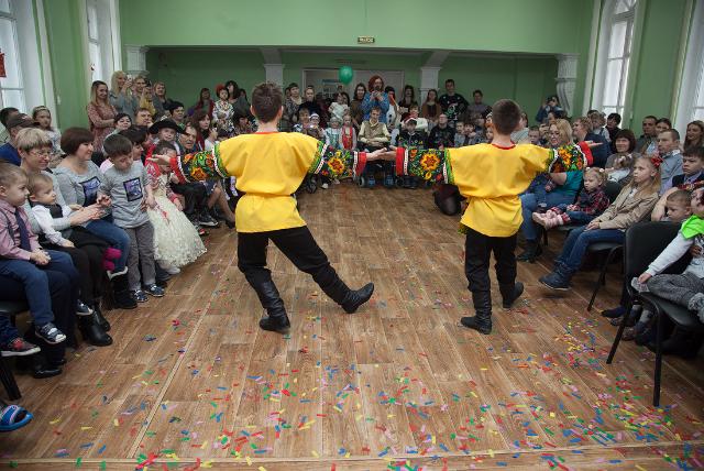 Начало праздника затягивается: родители с детьми-колясочниками опаздывают. Но когда они, наконец, приезжают, волонтёры дружно выбегают на улицу и помогают ребятам подняться. Все в сборе. Начинаем.