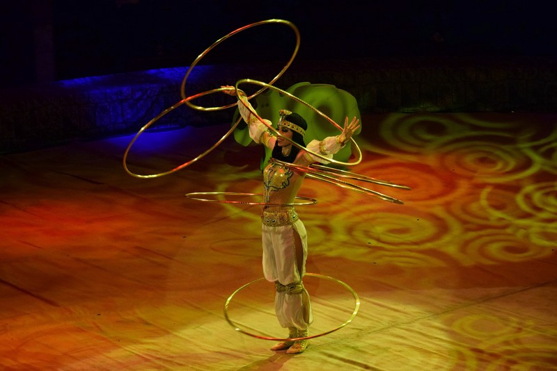 В программе собрали лучших артистов компании «Росгосцирк», некоторые из которых задействованы далеко не в одном номере спектакля. К примеру, у Кристины Нусс в шоу три полноценных номера и еще в нескольких она принимает участие. Вместе с мужем они работают эквилибр на катушках (в финале супруг Кристины балансирует сразу на 8-ми цилиндрах!), а вот «Игра с хула-хупами» – самостоятельный номер девушки, которая восхитительно крутит сразу 30 обручей, причем в воздухе!