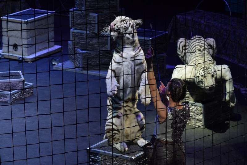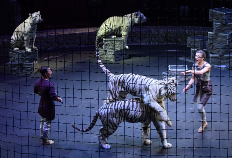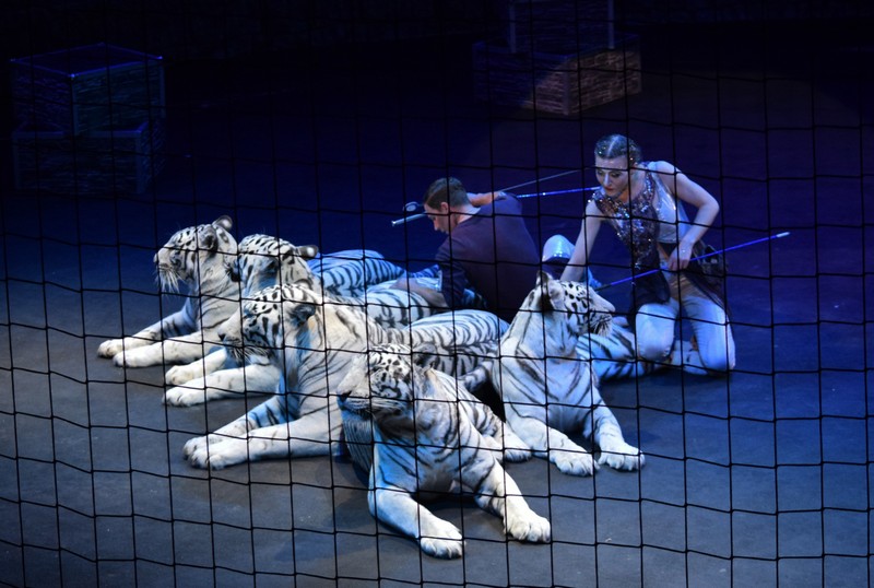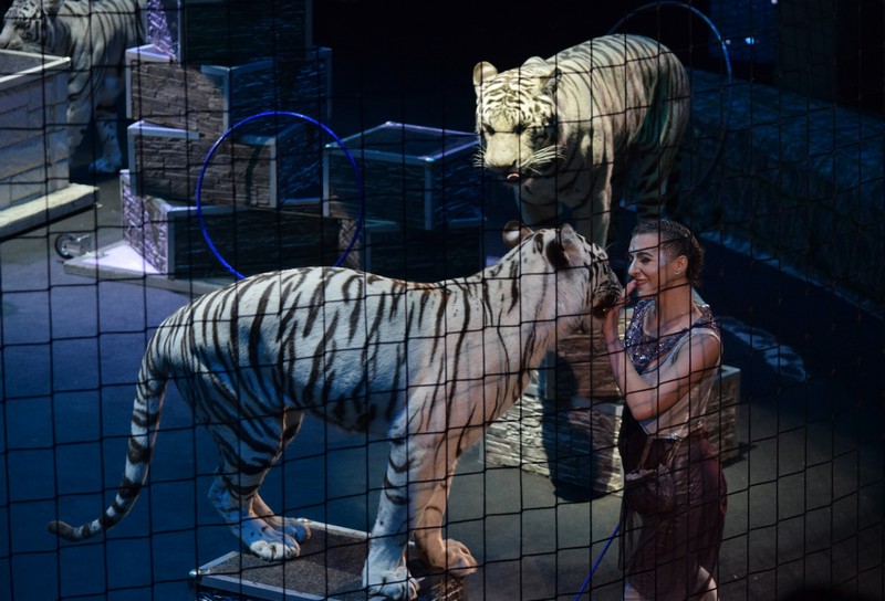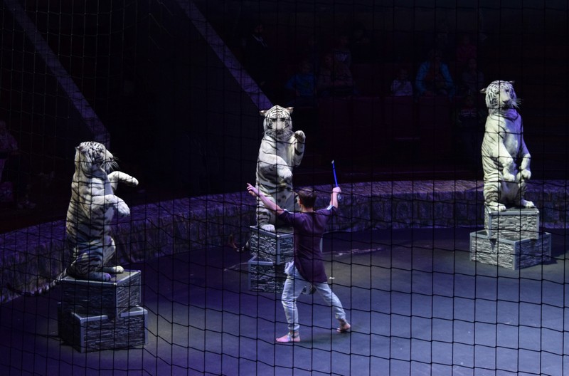 Тигры Алисы Нестеровой и Алексея Поручаева выполняют трюки без всякого принуждения, что называется – по любви. Прыгают с тумбы на тумбу, в кольцо, проходят под тумбами и позволяют дрессировщику пролазить под собой.