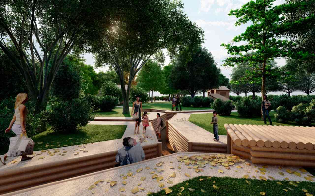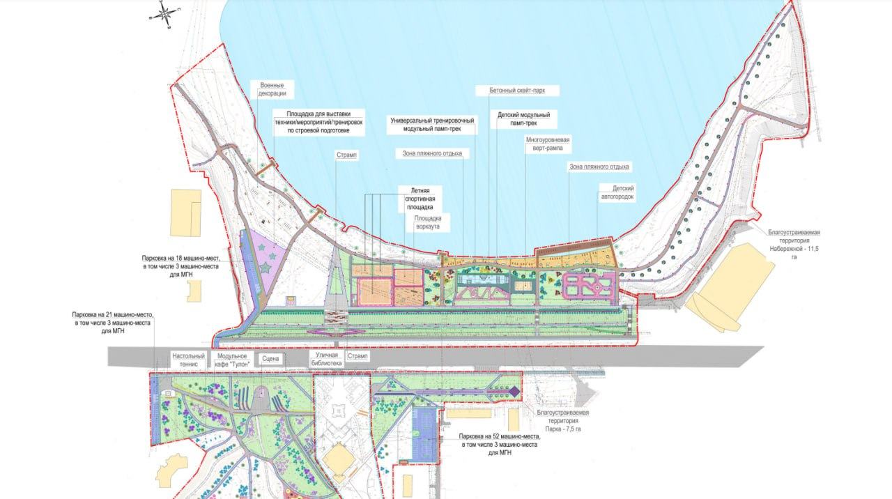 На набережной будут организованы пространства для выставки техники, военных декораций, исторических реконструкций. Рядом авторы проекта предлагают создать зону активного отдыха со скейт-парком, детским автогородком, площадкой для занятий спортом.