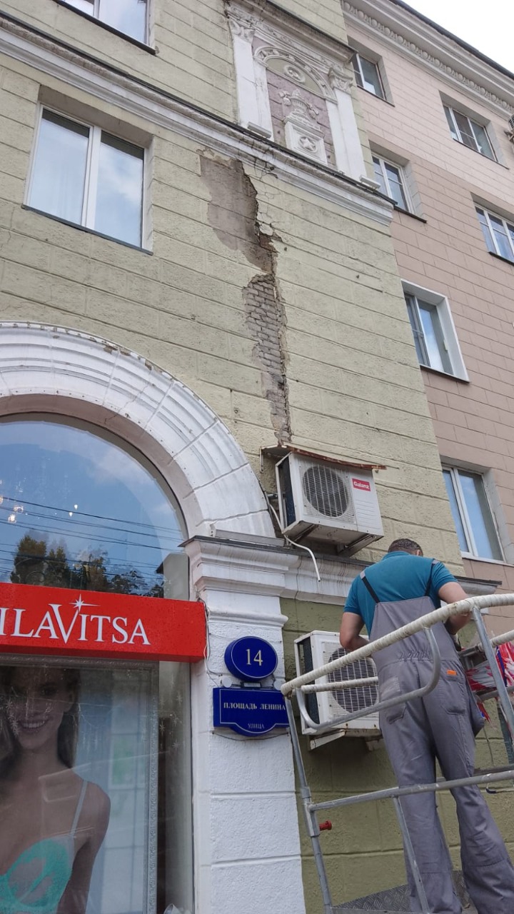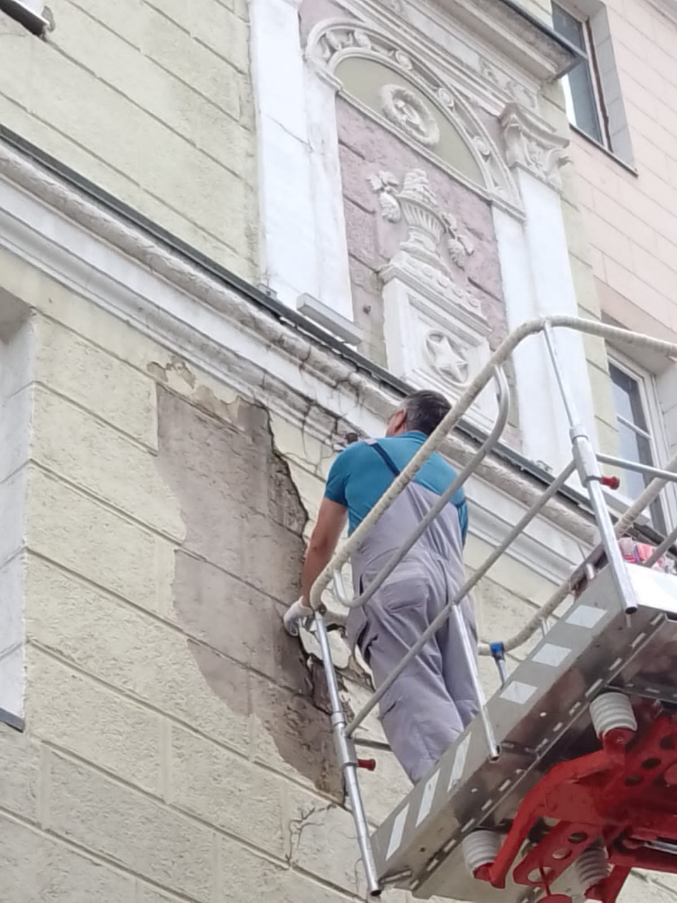 Во время осмотра мы оценили объем работ и материалов для ремонта. Сейчас готовим всё и в ближайшее время, как только по прогнозу не будет дождя, приступаем к оштукатуриванию поврежденного участка фасада здания.