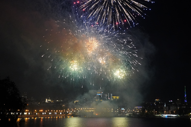 Самые удобные места для просмотра фейерверка успели занять зрители рок-фестиваля Fresh Sound, который с трех часов дня начался на Адмиралтейской площади, а завершился, можно сказать, с первым салютным залпом. Ровно в 21 час небо над водохранилищем раскрасилось первым причудливым узором.
