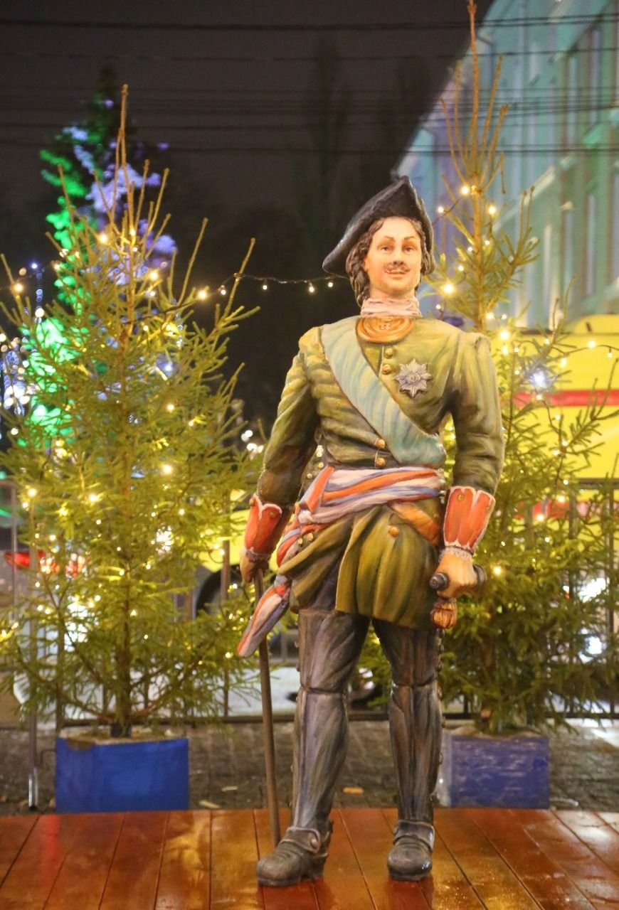 Вот горожан встречает сам Петр I: его зеленый императорский китель стал белым. Двухметровая фигура императора является, пожалуй, одной из самых интересных новогодних конструкций. Как добавляют в пресс-службе городской администрации, сфотографироваться с Петром смогут все желающие.