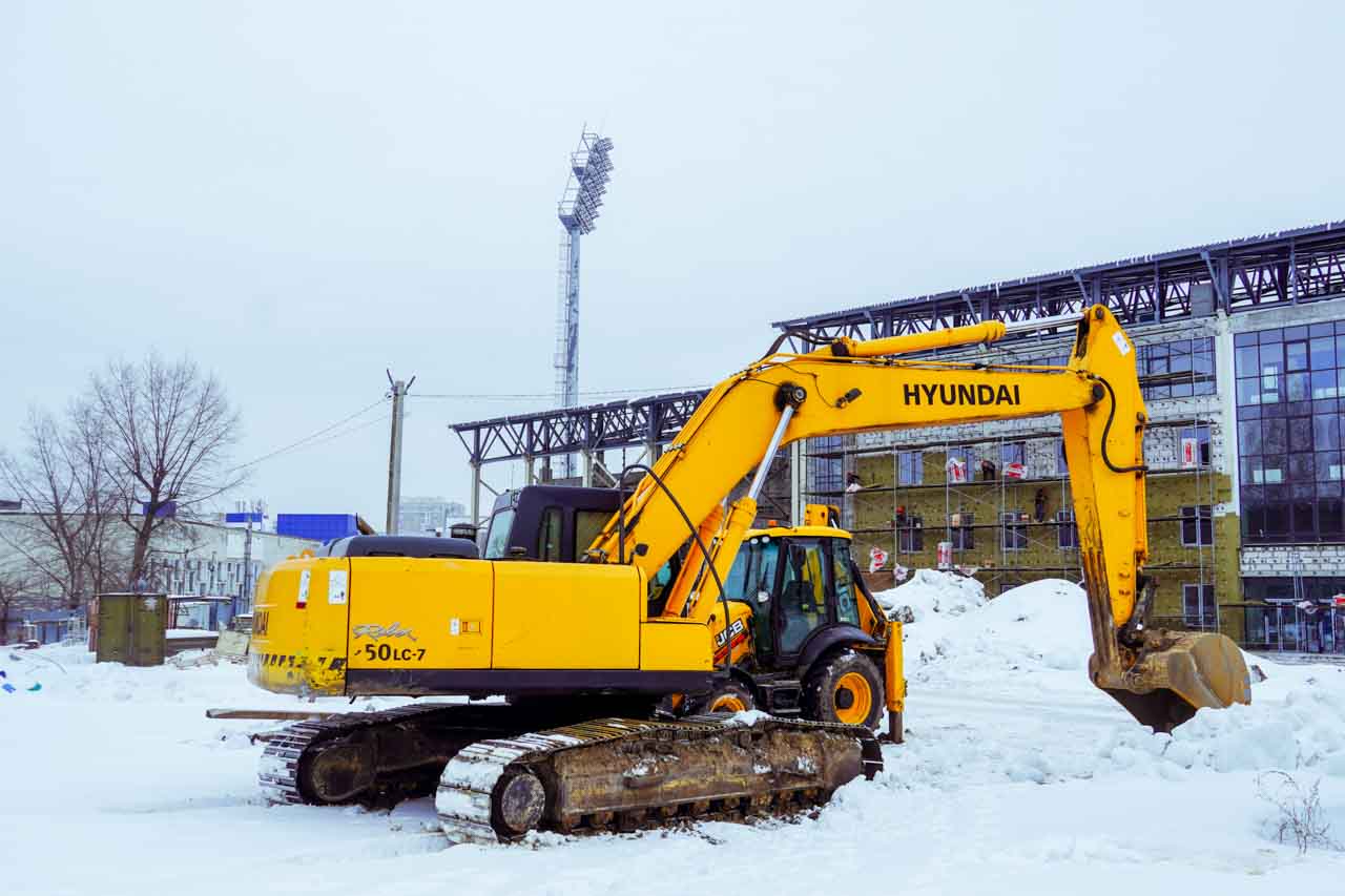 На данный момент проведены монолитные работы на четырех трибунах, установлены металлические колонны и фермы, выполнена их обвязка. Завершается монтаж перегородок, сетей водоснабжения, канализации, электроснабжения. Рабочие проводят штукатурные работы и работы по звукоизоляции, установке рам и окон. Объект подключен к инфраструктуре, ведется сборка каркаса касс и монтаж стоек и каркаса табло. Проведены и другие виды работ. Подрядчик приступил уже к устройству поля.