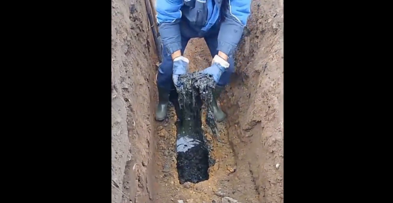 Коммунальщики извлекли из трубы около 1,5 кубических метров слипшегося мусора, который полностью заблокировал трубу диаметром 600 мм.