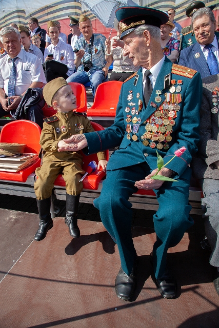 Ветераны, участники боевых действий, труженики тыла наблюдали за парадом с трибун. Они пришли задолго до начала торжественной части, чтобы увидеться друг с другом и пообщаться.