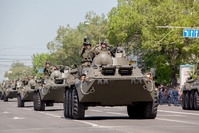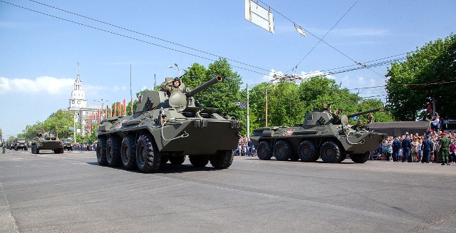 В параде механизированной колонны, которая двинулась сразу после прохождения последнего парадного расчёта,были задействованы бронеавтомобили «Тигр»; бронетранспортеры БТР-82А, принятые на вооружение в 2013 году; самоходные артиллерийские минометы «Нона-СВК», предназначенные для подавления артиллерийских и минометных батарей, а также ракетных установок; буксируемые 152-миллиметровые гаубицы «Мста-Б», способные уничтожить цель на расстоянии до 30 км; другие единицы техники. Всего – 29 машин.