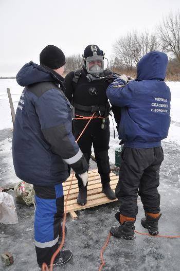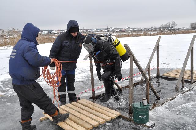 Водолаз Роман Агеев полностью готов к работе. Сегодня у него, можно сказать, дебют – он погружается в воду накануне Крещения впервые, хотя опыт подобной работы, ни много ни мало, 20 лет. Под водой он проводит всего пару минут – этого достаточно, чтобы обследовать дно проруби и уложить туда мешки с песком.