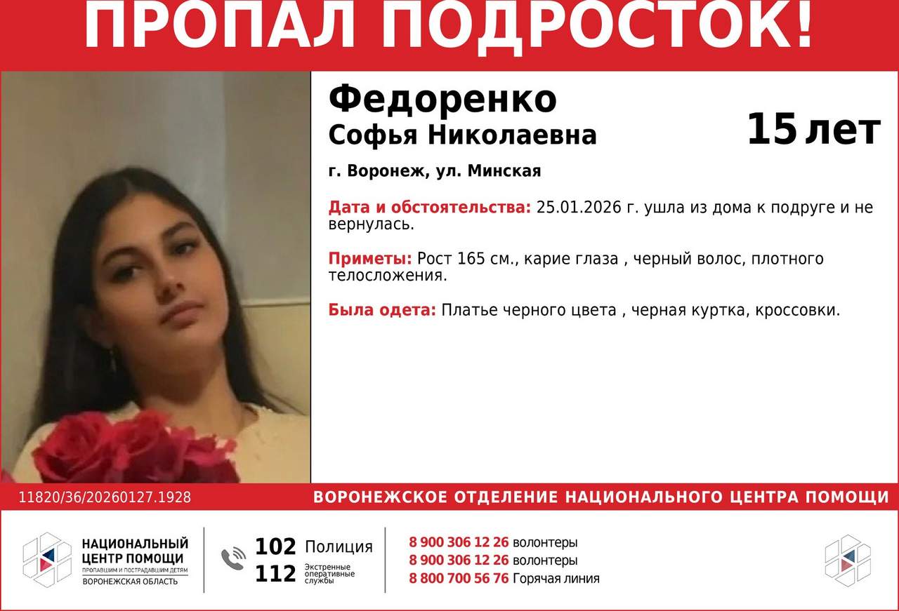 Напомним, что ранее «Горком36» сообщал о пропаже в Воронеже 12-летней девочки. Она исчезла 25 января после того, как вышла из дома на улице Минская. Однако спешим успокоить наших читателей, по информации Национального центра помощи - Воронежская область, девочка нашлась. Она жива.