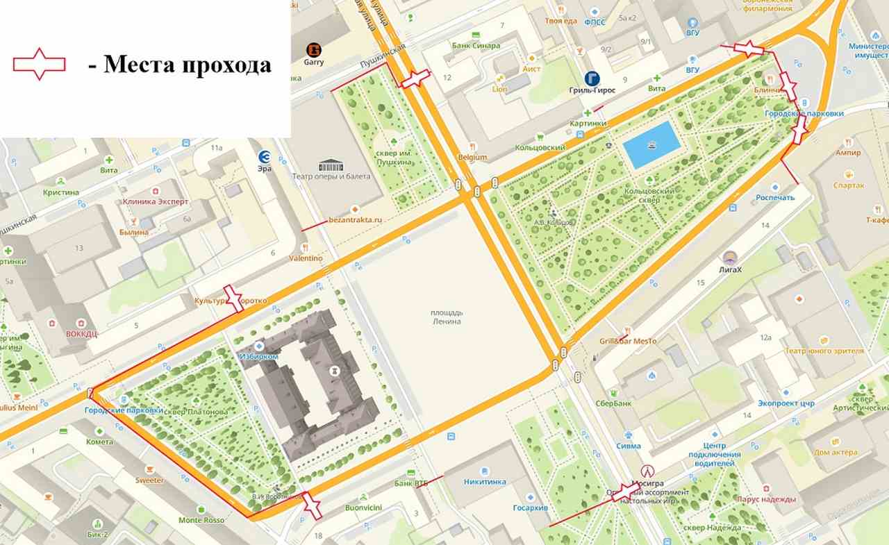 · – № 70, С70, 88 – с улицы Ворошилова по улицам Фридриха Энгельса, Кольцовской, проспекту Революции и далее по маршрутам. В обратном направлении – с проспекта Революции по улицам Пушкинской, 20-летия Октября, Ворошилова и далее по маршрутам;