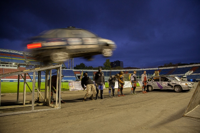 Места на трибунах стали занимать еще за час до выступления каскадеров. В это время трюкачи готовились: делали финальные обкатки автомобилей, проговаривали сценарий – это важный элемент шоу. Как мне позже объяснит основатель театра Геннадий Кочерга, даже экстрим-шоу должно быть сюжетным, приковывать внимание зрителя обыкновенной зарисовкой из жизни.