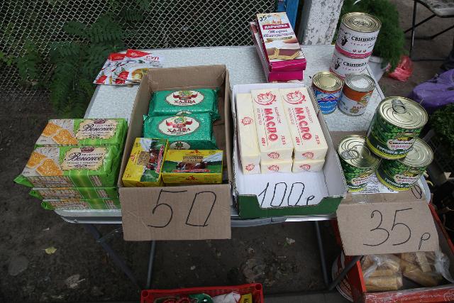 Рядом в антисанитарных условиях женщина продавала зелень, как она утверждала, с собственного огорода. А ещё масло, маргарин, вафли и печенье – вероятно, произраставшие на ветках там же, на огороде.