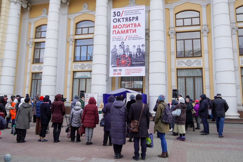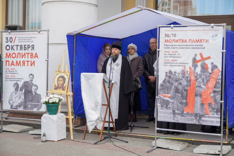 А еще в этот день, тоже по традиции, все желающие читали имена репрессированных. Возле кинотеатров «Спартак» и «Пролетарий» по благословению митрополита Воронежского и Лискинского Сергия прошла ежегодная «Молитва памяти». С 2010 года ее организует Преображенское братство.