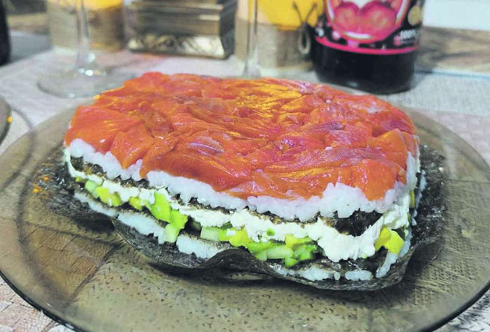 На дно кладем лист нори, на него – тонкий слой риса, следом – порезанные мелкими кубиками огурец, затем авокадо, творожный сыр, еще лист нори, второй тонкий слой риса и узкие ломтики рыбы. Снимаем борта, кладем рядом листики имбиря, васаби – ленивые роллы готовы.
