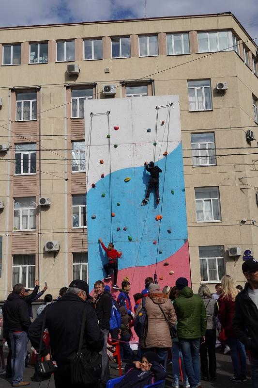 Здесь же проходят показательные выступления каратистов. Дети выстроились в очередь к скалодрому.