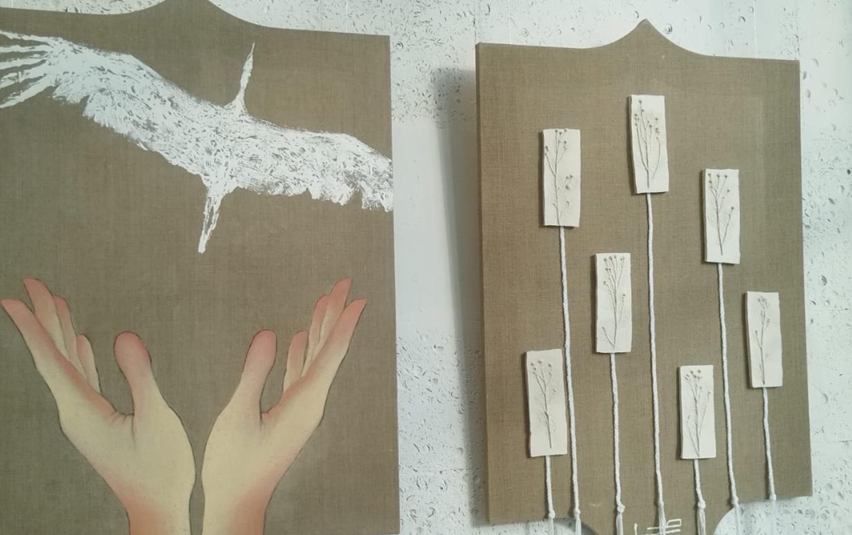 Обращают на себя внимание две работы Екатерины Косяк, выполненные в смешанной технике. Они носят название «Отпускать» и «Прорастать».